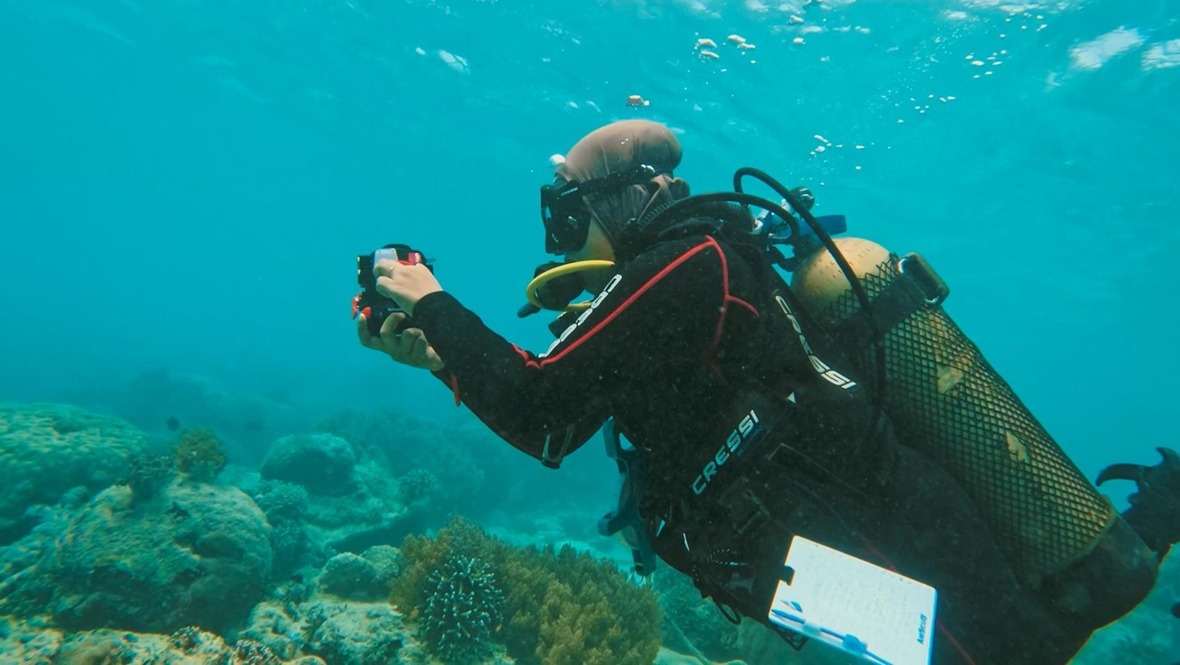 Putri Wulandari, Environment Marine Foreman, sedang melakukan pengecekan kualitas air laut dan mendokumentasikan kondisi ekosistem sebagai bagian dari pemantauan lingkungan.